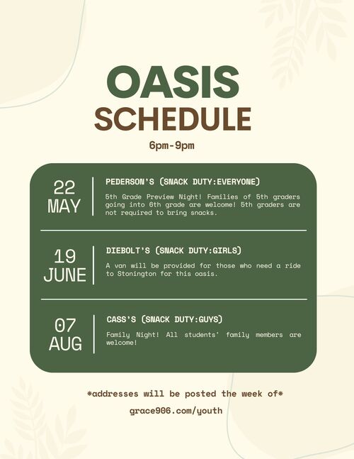 🗹 Our Family Night oasis will be August 7th! Join us at the Cass's home for a fun evening of fellowship!